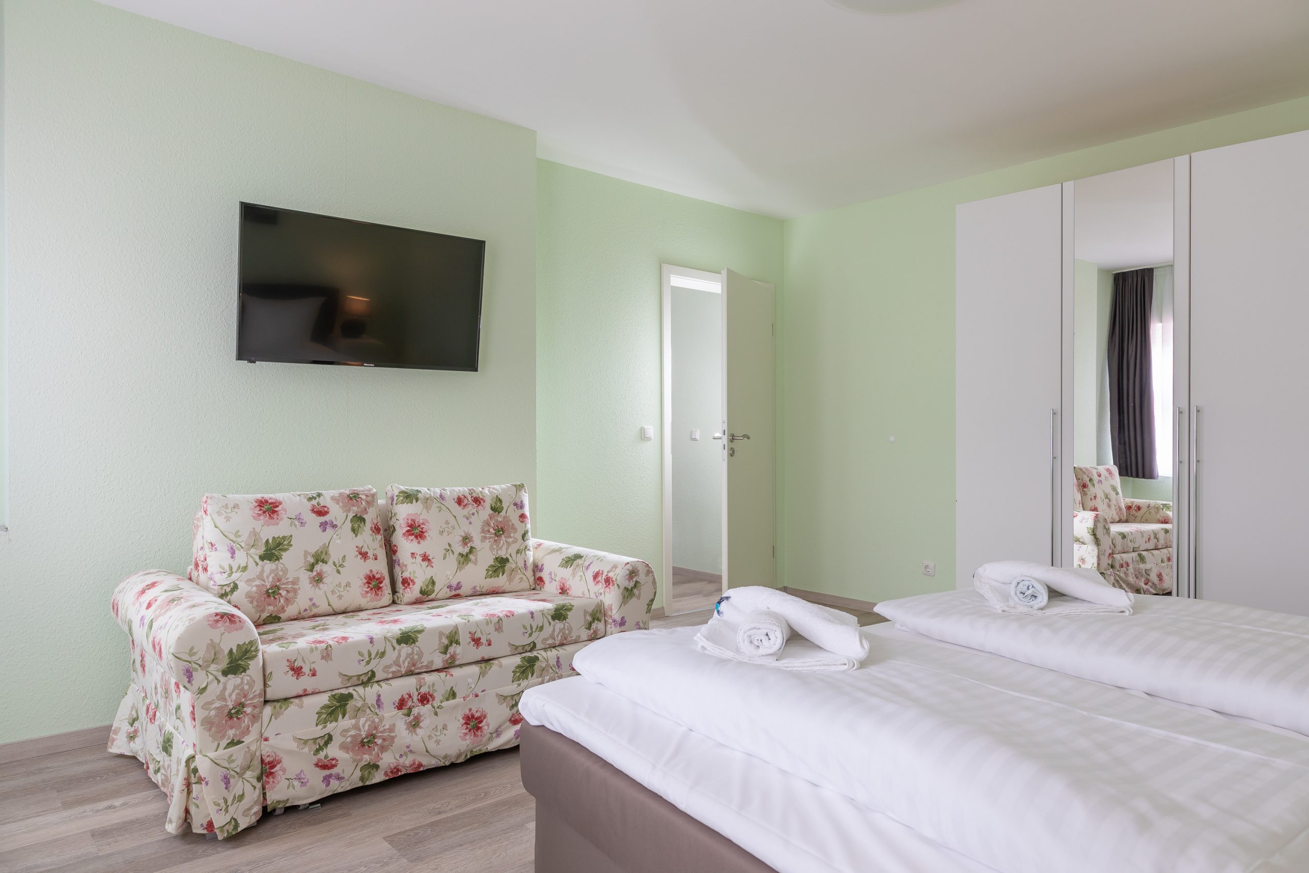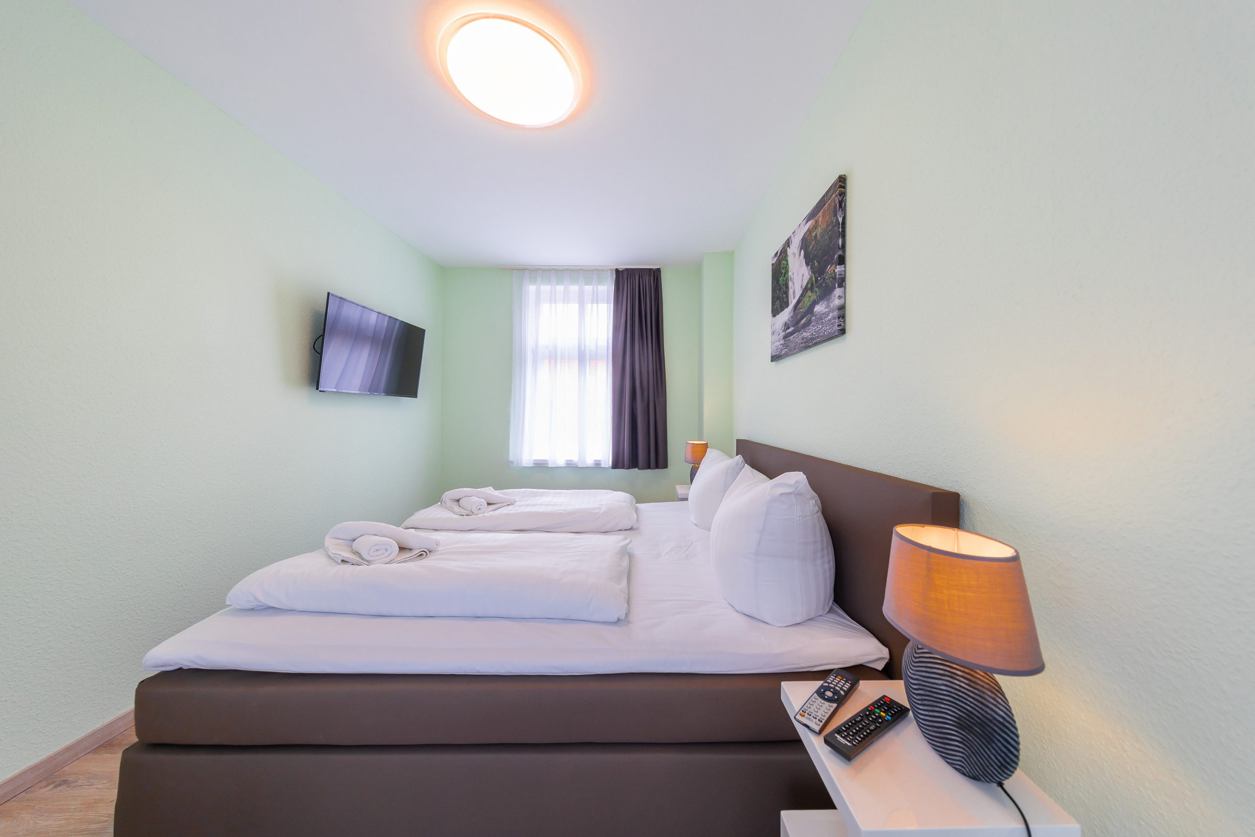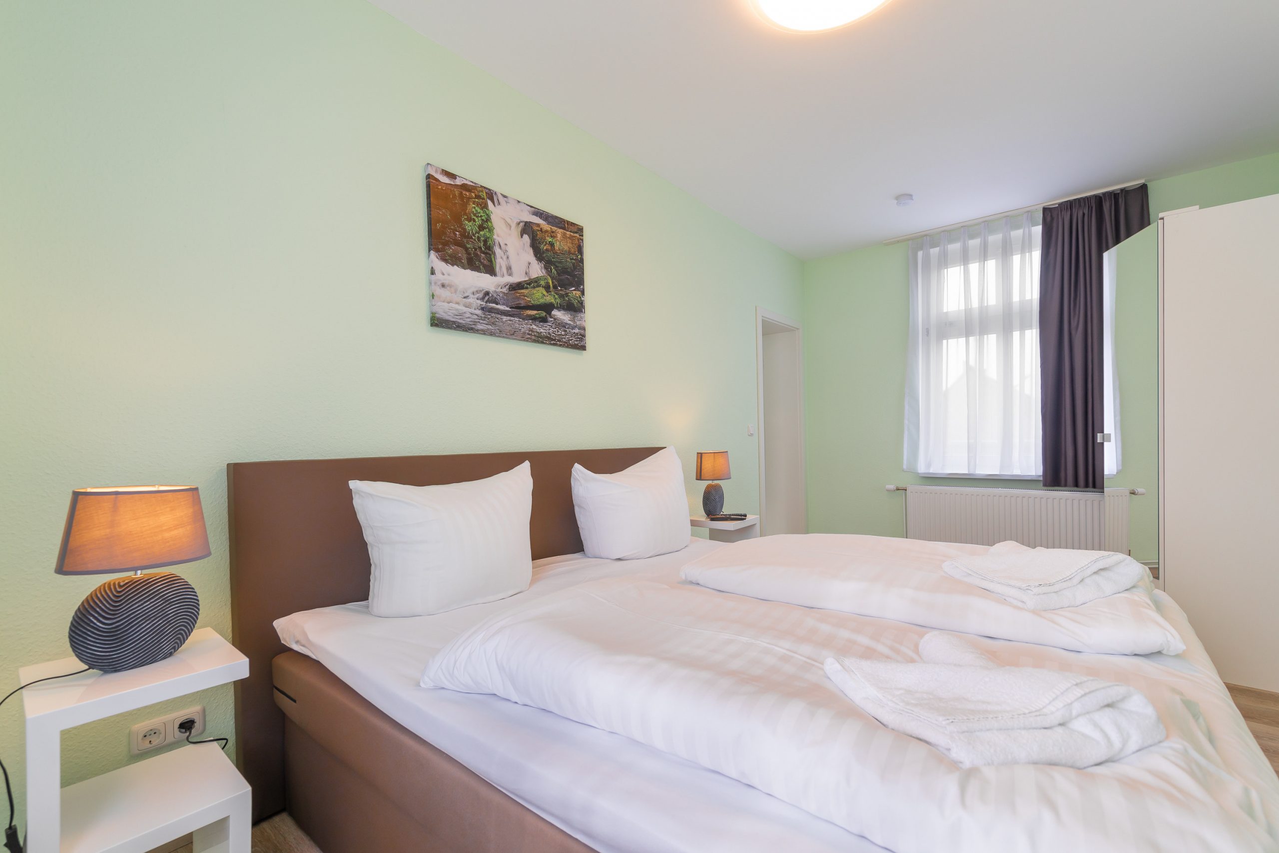 Die Wohnung (ca. 45qm) liegt im Erdgeschoss des Seitenflügels, also um die Ecke zum Boulevard. Neben einem separaten Schlafzimmer (1,80 m breites Boxspringbett), einem Flur, einem Badezimmer verfügt die Wohnung über ein Wohnzimmer mit offener Küche. Zwei Personen finden hier eine komfortable Unterkunft. Die Sitzgarnitur im Wohnzimmer ist aufbettungsfähig, sodass bei Bedarf ein weiterer Gast dort übernachten kann. Neben dem großen Fernseher im Wohnzimmer ist ein weiterer Fernseher im Schlafzimmer vorhanden.