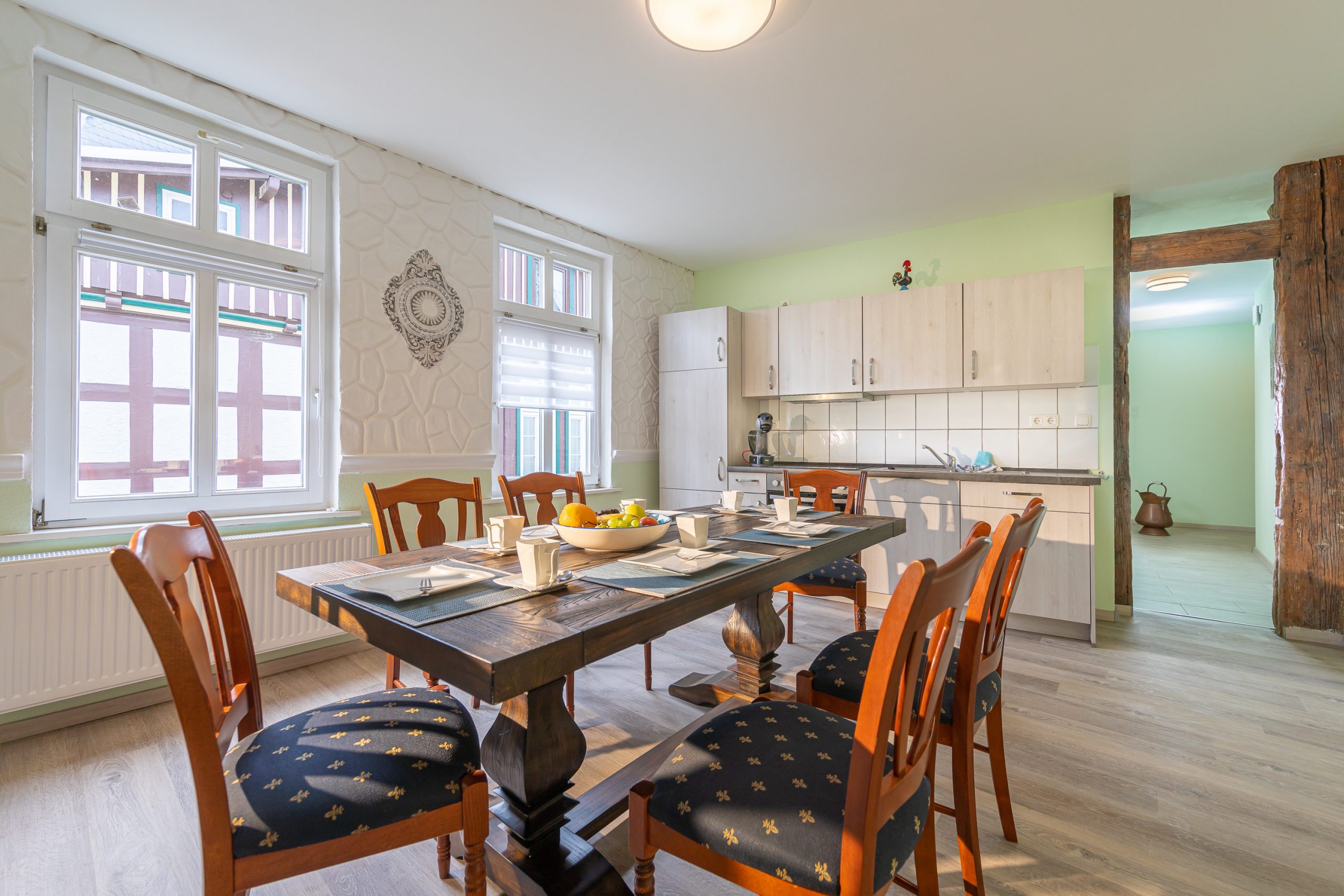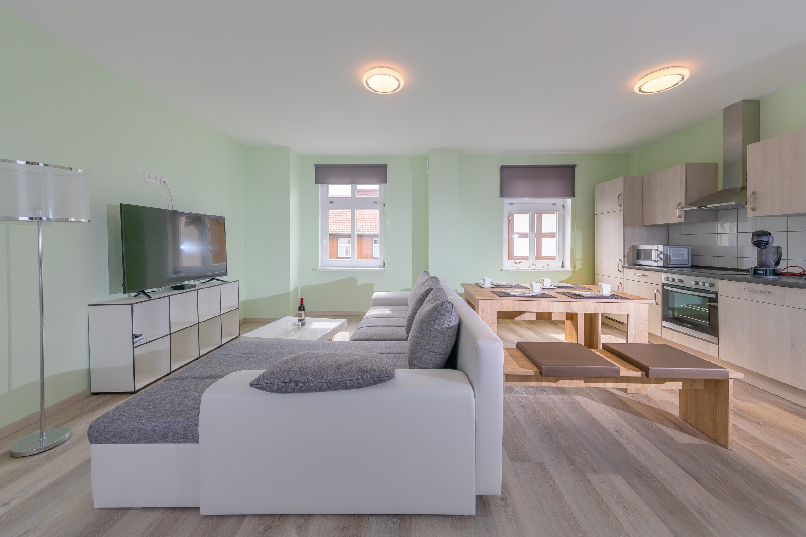 Ein großzügiges Schlafzimmer (1,80 m breites Boxspringbett) mit möglicher Aufbettung, ein großes Wohnzimmer ebenfalls mit Aufwertung ermöglichen für 2-6 Personen einen komfortablen Aufenthalt. Die Küche ist gleichzeitig das Esszimmer für bis zu sechs Personen.
